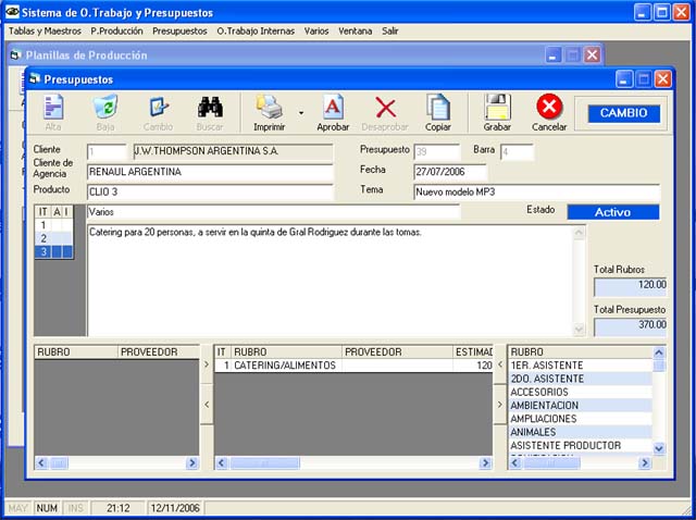 Permite la administración de Presupuestos para una Productora, con varias alternativas, comenzando desde la Planilla inicial de Producción, pasando por la generación de distintas alternativas de Presupuestos y finalizando con la Orden de Trabajo. Incluye Mantenimiento de Clientes, Proveedores y Rubros de Producción. Permite registrar Gastos por Items informando para cada trabajo Monto Presupuestado, Gastos y Utilidad. |