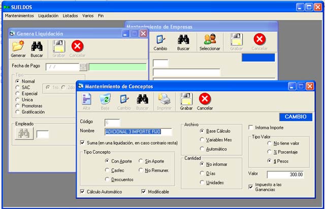 Completo sistema para realizar la Liquidación de Sueldos de una empresa. Contiene mantenimientos de Empleados, Familiares, Conceptos de cada Liquidación, Categorías de Empleados, Funciones y Tablas de Ganancias.